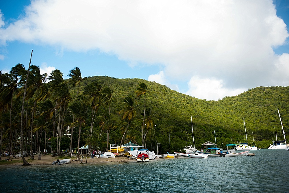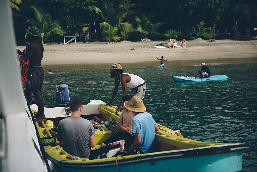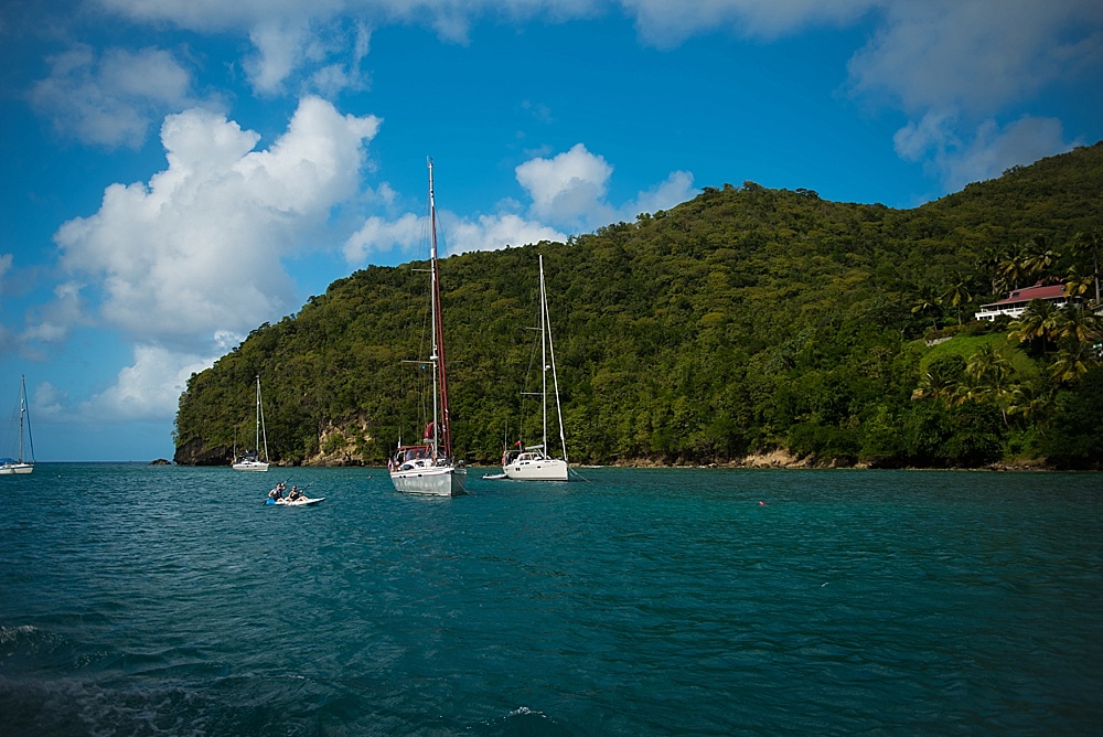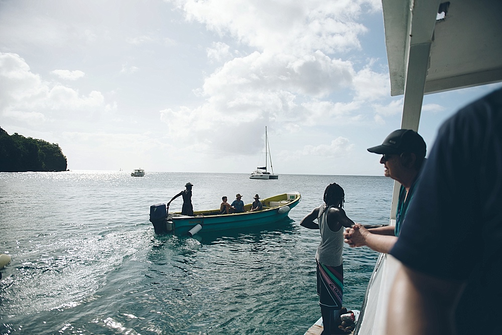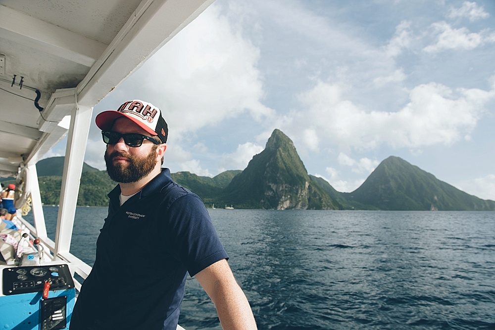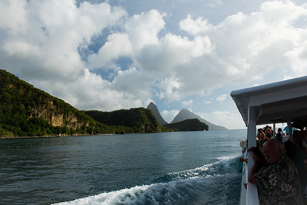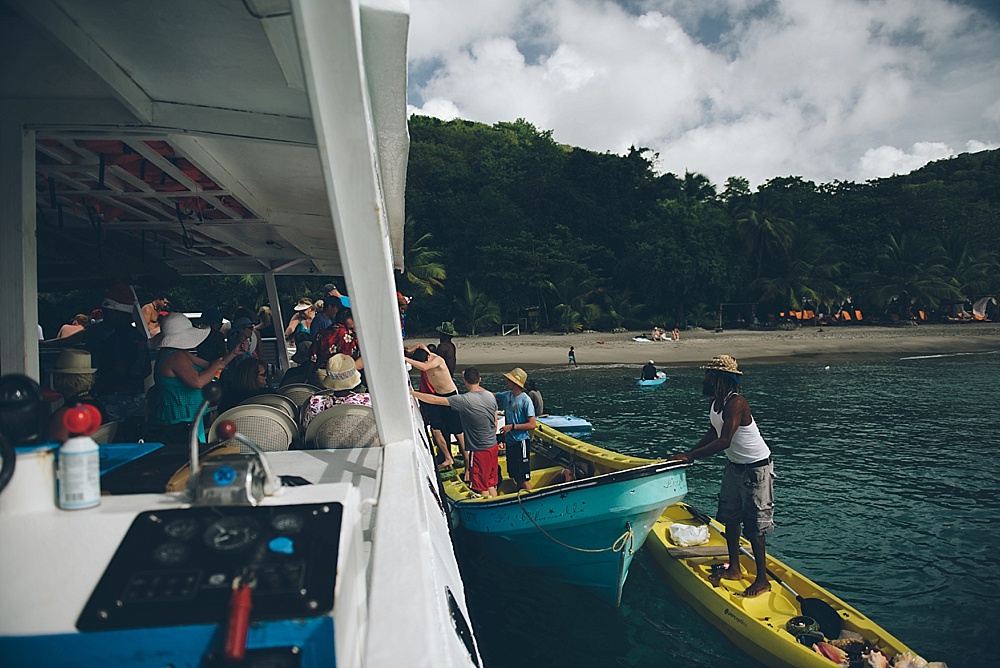 After church, we decided to hop on a catamaran tour that took us up the coast where we’d have the best view of St. Lucia’s most pronounced feature: two volcanically formed mountains called the Pitons (French for “Peaks”). On our way there, an eagle-eyed passenger (on the lookout for whales) spotted three kayakers on the horizon that appeared to be signaling for help (waving their hands in the air). The crew determined that the water was definitely too rough for any kayakers to be out as far as they were, and decided to go investigate. So, we turned our party boat around and headed nearly a mile further out to sea to meet up with the kayakers. It was lucky we did, as it turned out, the kayakers were very much in need of help. They had been dragged out by the current and the rough water (nearly 5ft swells) had not allowed them to get safely back to shore. They had been signaling for help for over an hour to every boat that passed them by. To much applause, the crew helped get them and their kayaks on board – even requiring one of the crew members to dive in to assist. We gave them a ride to our next stop (a gorgeous beach) where we spent some time snorkeling and swimming. From there, the kayakers caught a ride back to their hotel and we carried on with our journey to the Pitons, which were definitely worth the trip. Because of a combination of the gorgeous views and experiences we had there, St. Lucia will probably be remembered as our favorite of the islands.