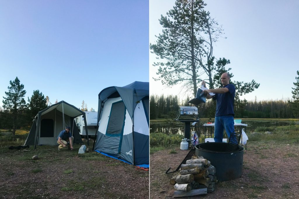 Rhett and I both grew up camping. Some of my favorite memories as a kid involve horses and pack-trips into the High Uinta’s, while Rhett’s revolve around canoeing expeditions to the far reaches of Yellowstone Lake with his grandpa and scout troop. There is something about being somewhere that no one else is. The sound of the wind through the trees. And the smell. The glorious smell of fresh mountain air and its crispness as you drink your hot cocoa in the morning. The campfires. The peace. Then, there’s also the bugs. The bears. The no toilets for miles. Being pregnant made that last one a little more of a challenge on our three camping trips this summer (four if you count Trek. I count Trek as… something else, haha). Still, though. Such great memories. Good food, good friends, and a queen-sized air mattress, complete with a memory foam topper. Hey, pregnant, remember? That’s why it’s called “glamping,” my friends. Here are a few photos from the latest trip, Marsh Lake, with our BFFs Jonathan and Susanna. Susanna is also pregnant; more pregnant than me. Needless to say, we ate well… and often 😉